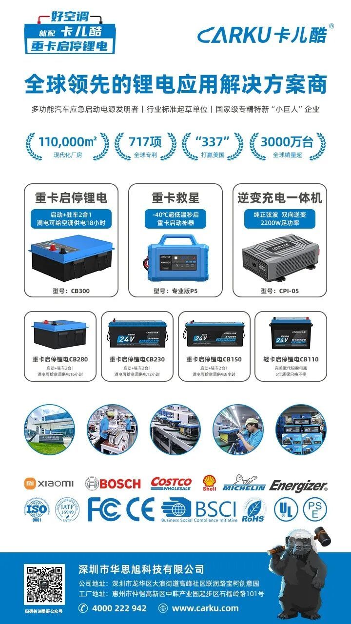 深圳市华思旭科技有限公司(品牌:CARKU卡儿酷)成立于2011年,是一家专业从事锂电技术应用产品研发、生产、销售的高新技术企业,国家级专精特新"小巨人"企业,国家知识产权优势企业,行业标准制定起草单位,中国储能电源行业标准起草副组长单位。